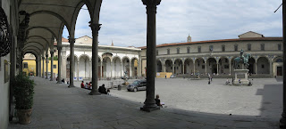 Mój sposób na Florencję jest prosty. Próbuję odrobinę ją strywializować. Na przykład usiąść na schodach przy placu Santissima Annunziata, naprzeciw renesansowej doskonałości Ospedale degli Innocenti, przy improwizowanej kolacji. Obok mieścił się mój fakultet, w jednej z zacienionych uliczek moja ulubiona biblioteka. Plac Santissima Annunziata jest zadziwiający, regularny, nigdy, może z wyjątkiem południa nie przepełniony, zawsze trochę po godzinach. Jakby miasto na lewą stronę, drugie oblicze pełnej turystów Florencji. Jak zaplecze Luwru. Za ścianą tętni życie, a tu - cisza, bezruch. Pompeje po wybuchu wulkanu.